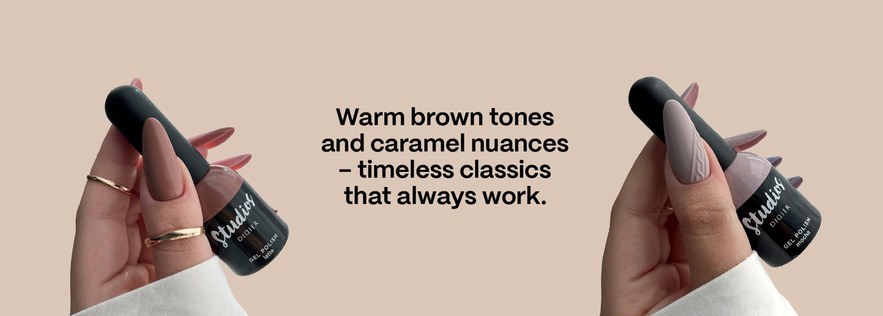 If you love calm, harmonious, and timeless looks, warm brown and caramel tones are just what you need. These classic fall shades give your hands a soft, natural elegance without ever being too much. They look especially beautiful paired with gold rings, cozy knits, or warm earthy outfits.
