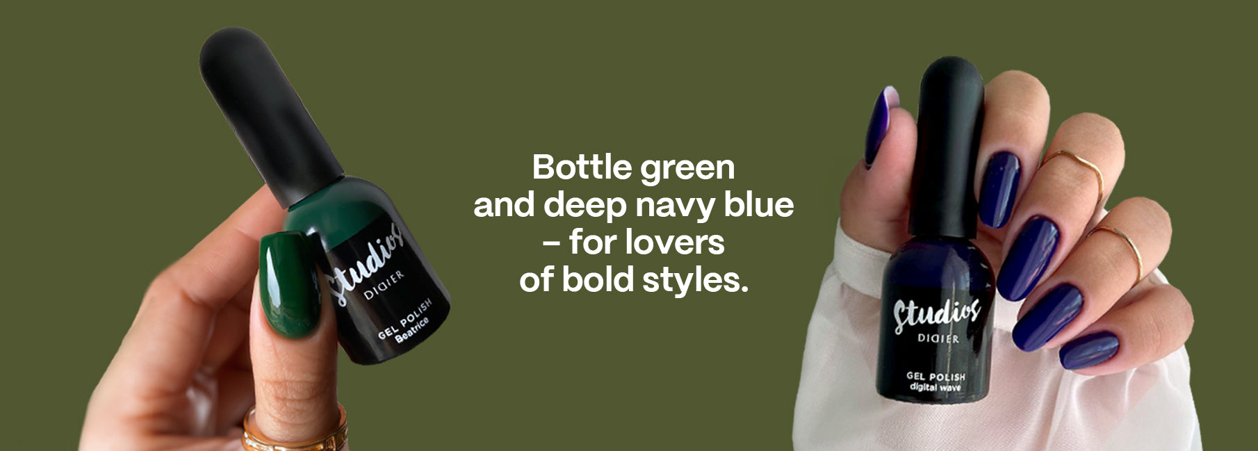 Want to make a statement with your look? Then bottle green and deep navy blue are your go-to shades. These powerful, intense tones are not only unique but also right on trend. They bring depth and character to your nails – like a dark, chic coat with a wow effect.