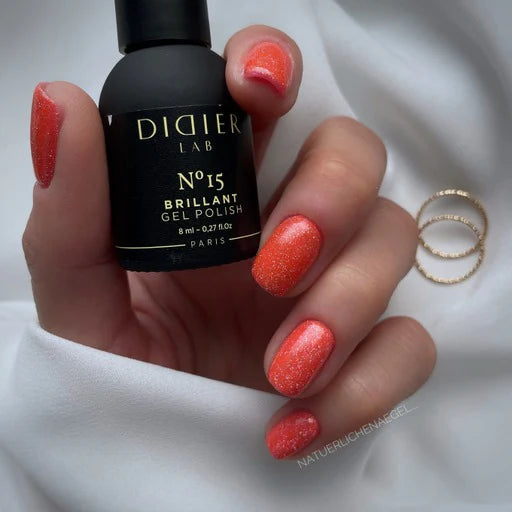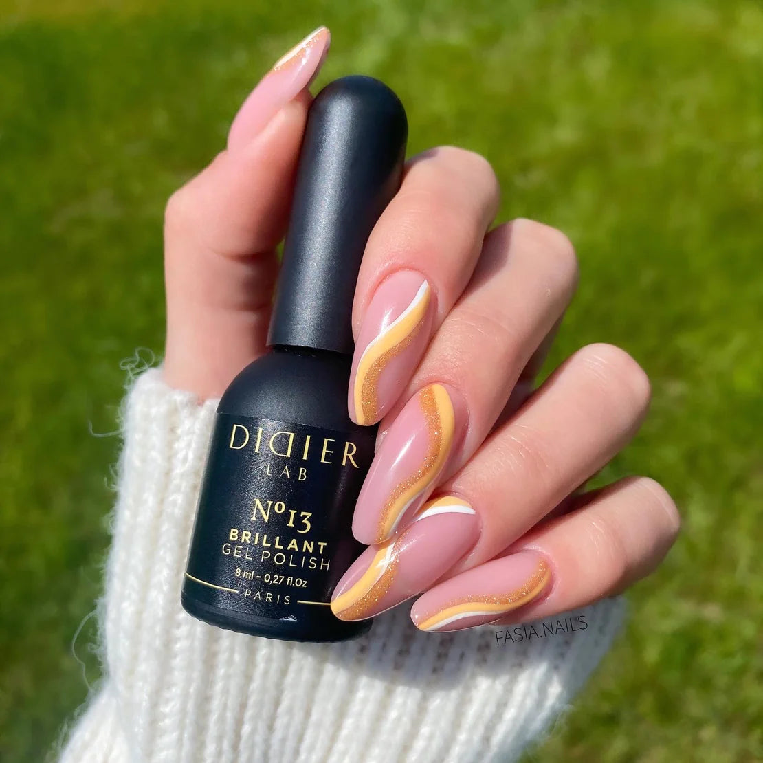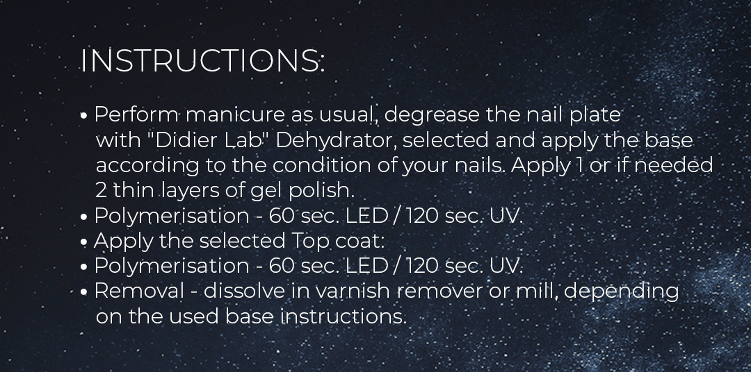After performing the manicure, degrease the nail plate with Didier Lab Dehydrator, and apply a base suited to the condition of the nail. Then apply 1 or, if needed, 2 thin layers of gel polish.