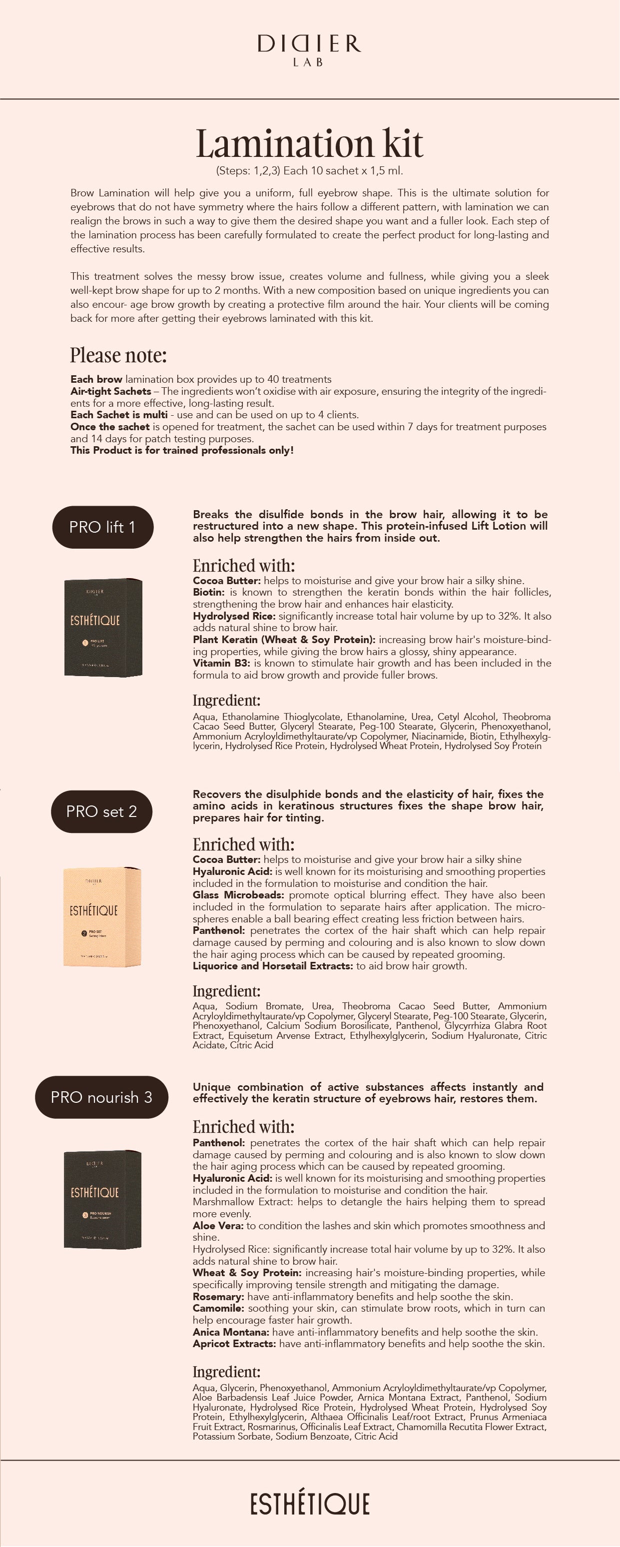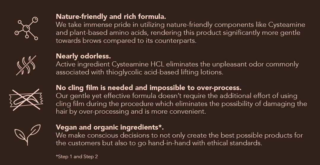 Soluble Collagen – supports the effectiveness of the lamination procedure by promoting hydration and enhancing the flexibility and elasticity of the brow hairs, making them more manageable and better shaped.