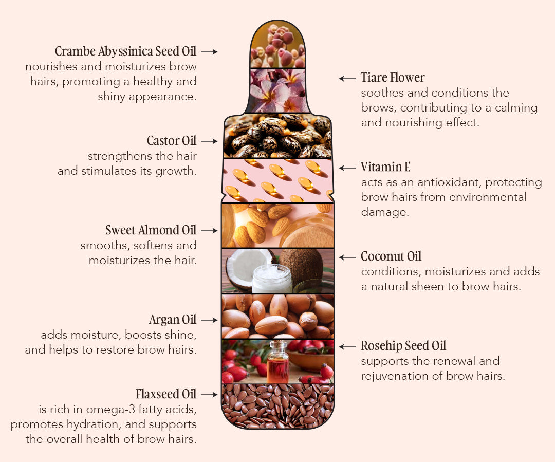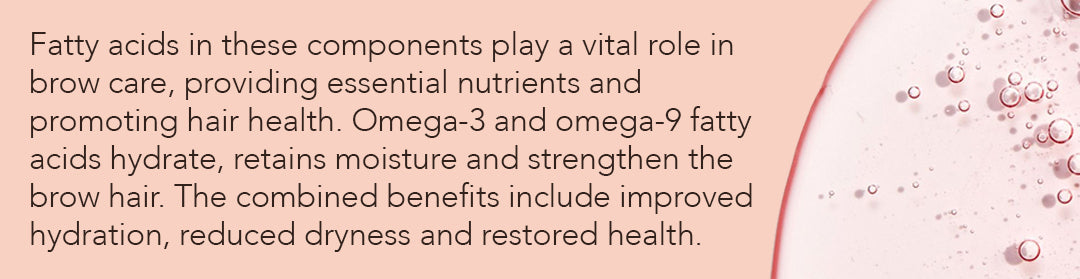 The fatty acids contained in the ingredients of the oil play a very important role in the eyebrow care, providing essential nutrients and promoting overall hair health. Omega-3 and Omega-9 fatty acids contribute to hydration, water retention and strengthening of eyebrow hairs. The combined benefits include improved elasticity, reduced dryness and a shiny, revitalized appearance, making them essential for maintaining healthy, nourished brows.