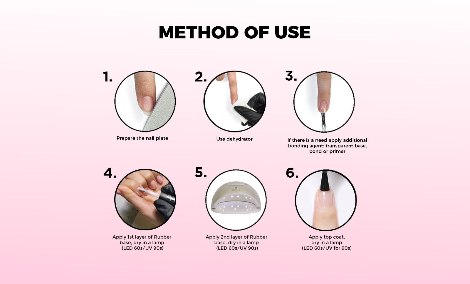 Cure each layer for **90 seconds** in **UV** or **60 seconds** in **LED** lamp. If applying the base in a thicker layer, cure it **twice as long** in the lamp.