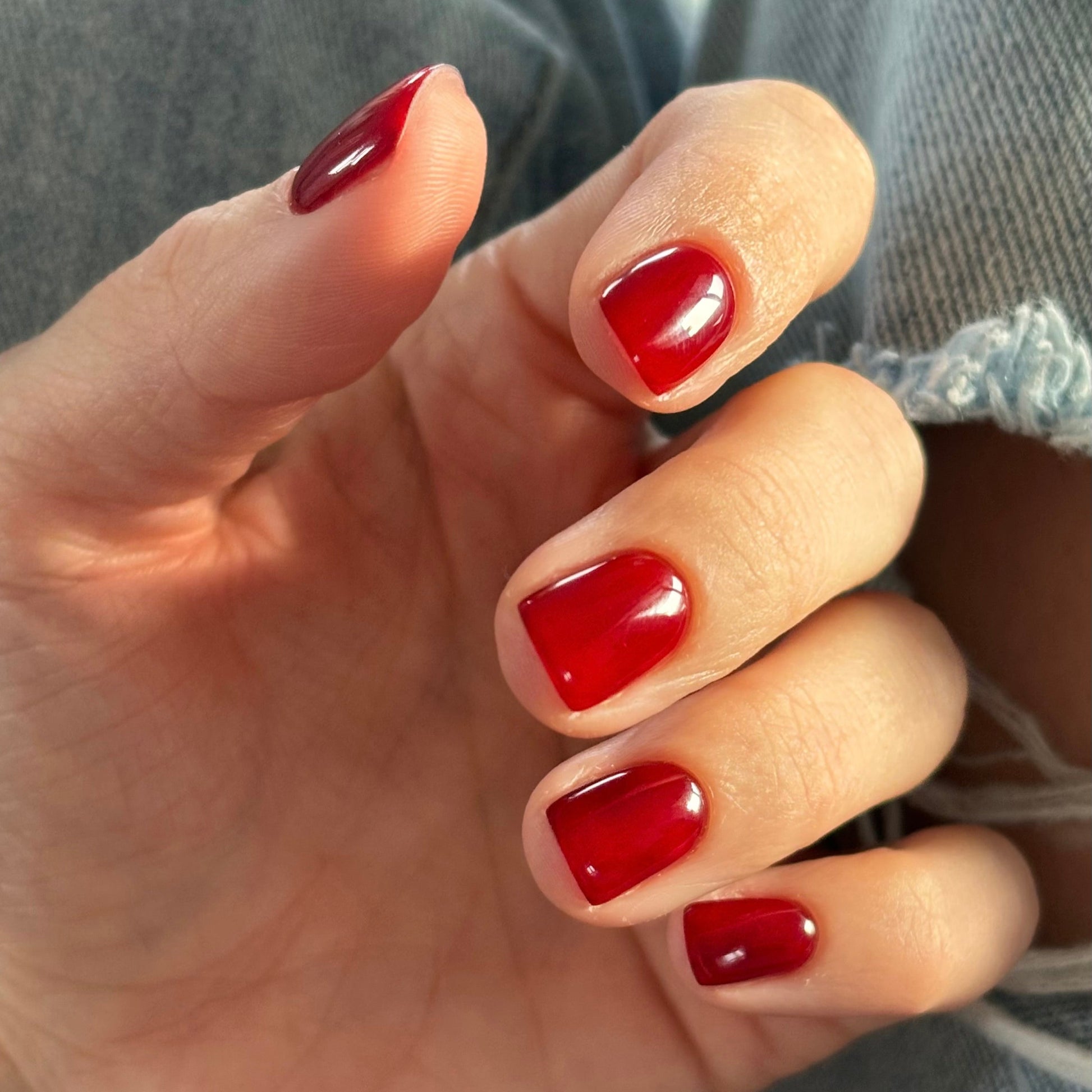 Stained glass gel polish creates a semi-transparent, glass-like effect with a deep, colorful look.