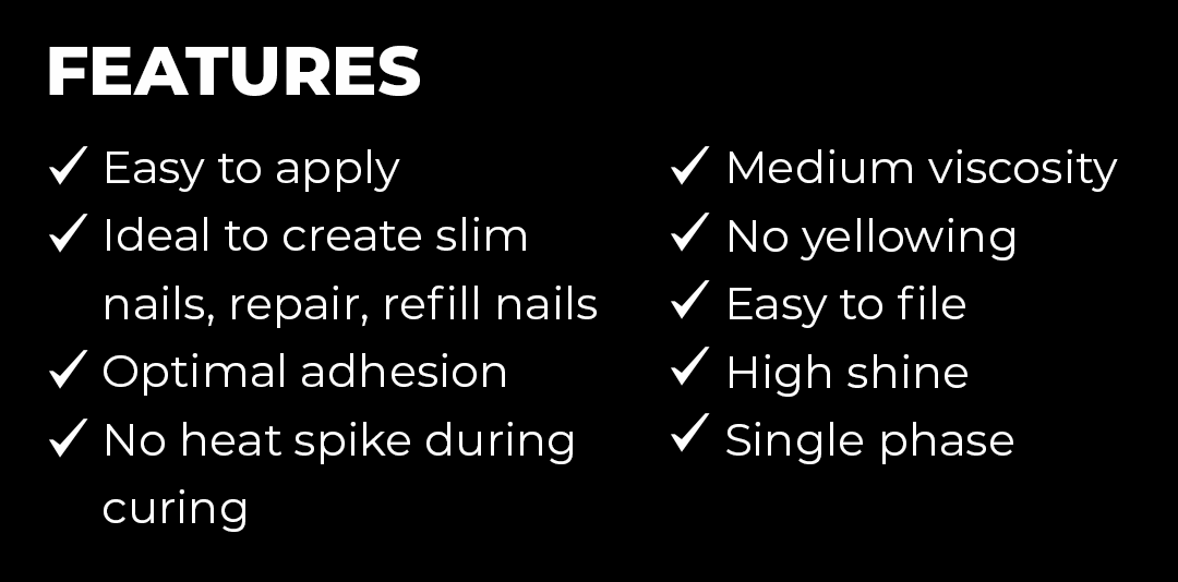 Thanks to the glass fibers contained in this product, it has excellent durability and strength. The gel combines the following properties: