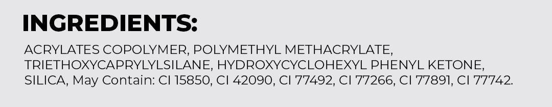 ACRYLATES COPOLYMER, POLYMETHYL METHACRYLATE, TRIETHOXYCAPRYLYLSILANE, HYDROXYCYCLOHEXYL PHENYL KETONE, SILICA. May include: CI 15850, CI 42090, CI 77492, CI 77266, CI 77891, CI 77742.