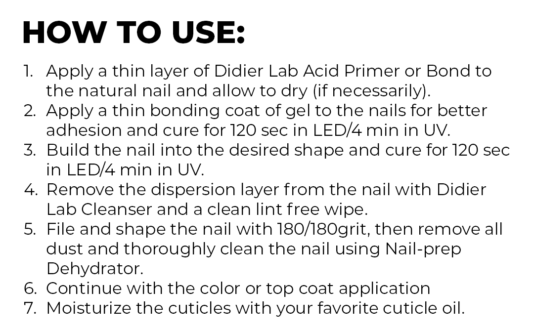 Remove excess oil and moisture from the nail plate with Didier Lab Dehydrator.