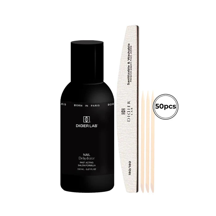 With the Didier Lab Nail Preparation Set, every manicure begins like a professional. The set includes a degreaser (150 ml), which removes excess moisture and prepares the nail surface perfectly for the next step. It is complemented by a high-quality nail file (180/180), disinfectable and reusable, as well as 50 wooden sticks, ideal for gently pushing back the cuticles.